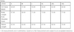 | Half Chest Measurement | 49.5 | 52 | 54.5 | 57 | 59.5 | 62 | 64.5 | 69.5 |